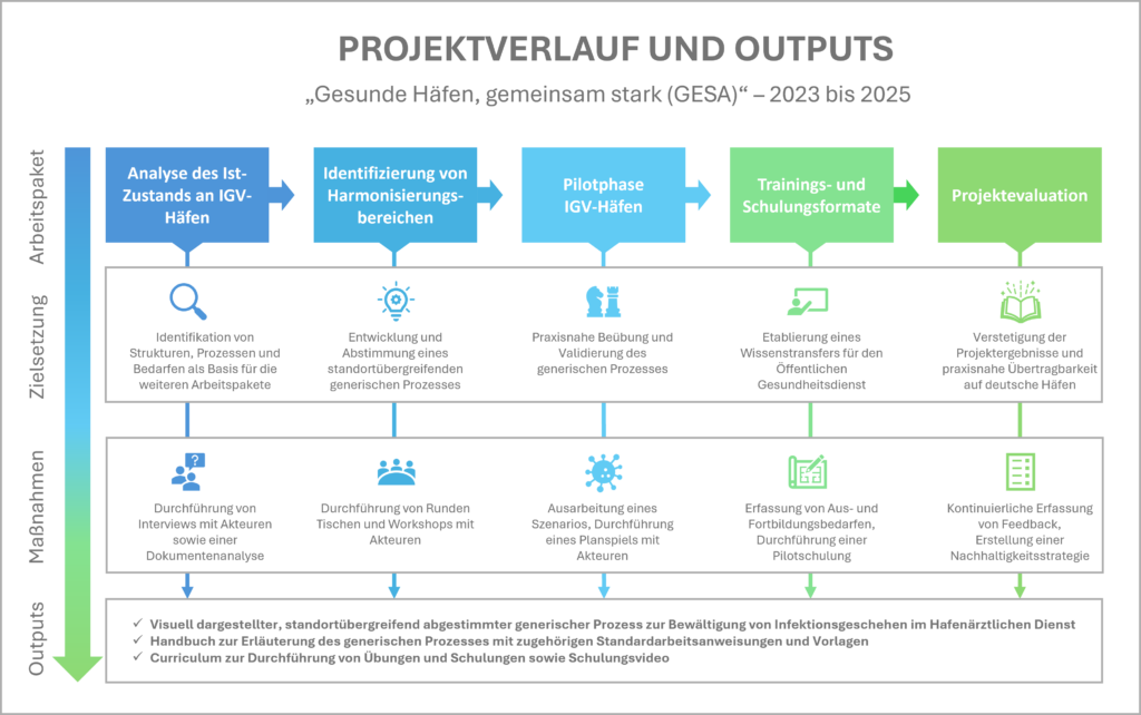 Wir freuen uns, dass unser Artikel Bewältigung infektiologischer Gefahrenlagen in deutschen Häfen: Entwicklung eines standardisierten Konzepts im Verbundforschungsprojekt ‚Gesunde Häfen, gemeinsam stark (GESA)‘ online-first im Bundesgesundheitsblatt erschienen ist. In dem Artikel stellen wir die Erhebung des Ist-Zustands an den IGV-Häfen dar, erläutern die Entwicklung eines generischen Prozesses zur Bewältigung infektiologischer Gefahrenlagen und geben Einblicke in unsere Konzepte zum Wissenstransfer der erarbeiteten Inhalte. Durch diese Publikation werden das Projekt GESA und unsere Ergebnisse in der Fachöffentlichkeit sichtbarer. Wir danken allen Beteiligten für ihr Engagement.